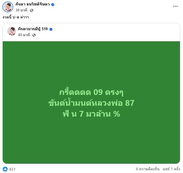 แม่น้ำหนึ่ง ยังโพสตด้วยว่า “กรี้ดดดด 09 ตรงๆ ขันต์น้ำมนต์หลวงพ่อ 87 ฟั น 7 มาล้าน %” แฟนหวยเข้ามาขอบคุณ ขณะที่มีคนเสียดายเห็นแล้วไม่ได้ซื้อ เป็นต้น