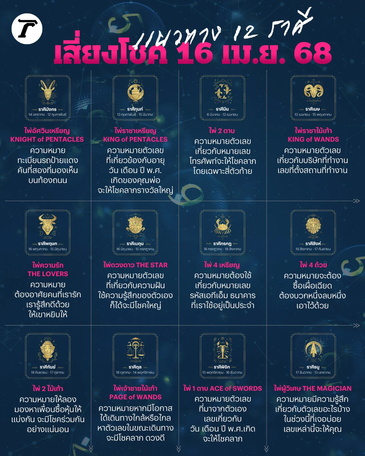 ราศีที่มีโอกาสถูกรางวัลที่หนึ่งในวันพุธที่ 16 เมษายน 68 ได้แก่ราศีกุมภ์ เมถุน ธนู มังกร พฤษภ เมษ ตุล กันย์ กรกฎ พิจิก